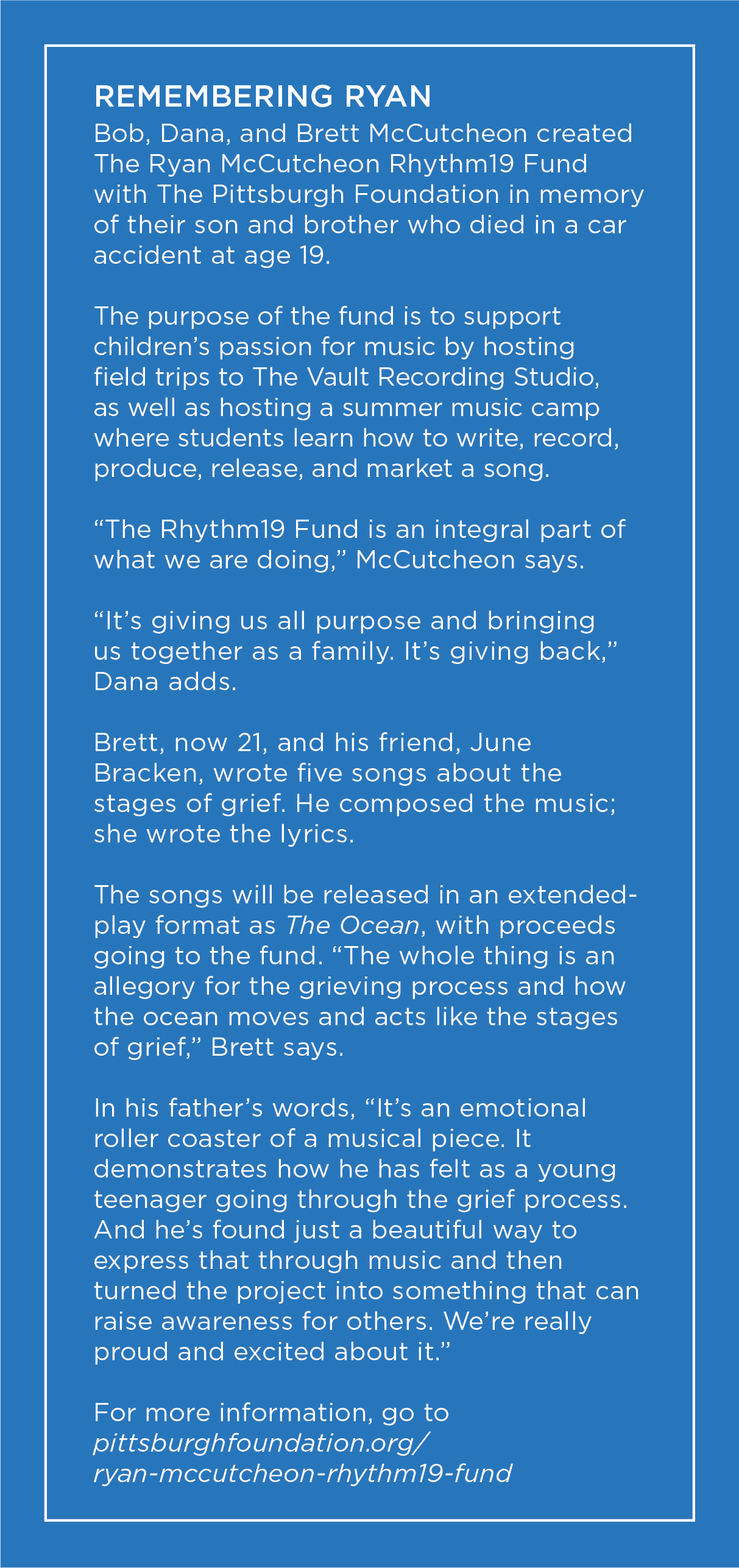 The family established the Ryan McCutcheon Rhythm19 Fund with The Pittsburgh Foundation to support children’s love of music in a variety of ways. “We are keeping Ryan’s memory alive,” Dana says. “We mention Ryan’s name every day.”