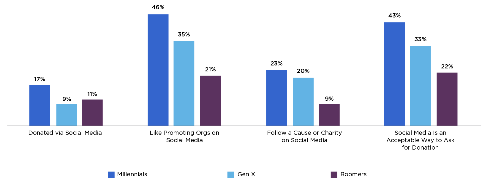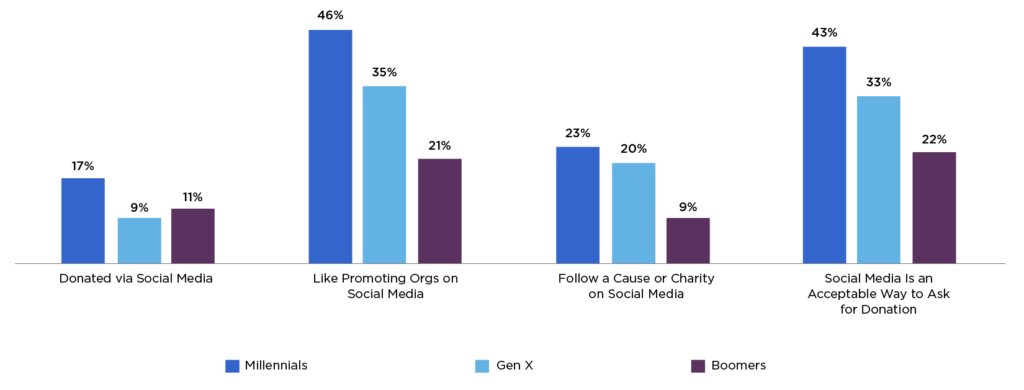 As Figure One shows, almost half of millennials who have given charitably enjoy promoting nonprofit organizations through their social media accounts. Additionally, millennials are twice as likely as baby boomers to follow a cause or charity on social media. And they’re nearly twice as likely to see social media platforms as an acceptable way to ask for donations.